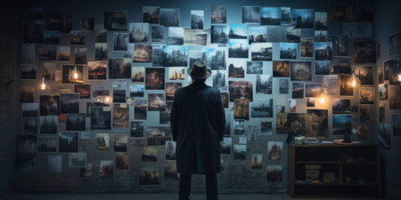 Focused detective studying photographs, immersed in solving a case in a dark setting. AI generative.