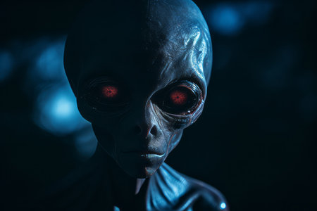 an alien with glowing red eyes in the dark