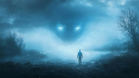 A silhouetted man stands on desolate ground, facing a gigantic, scaly monster head with bright, glowing eyes that appears through thick, blue fog and rain.