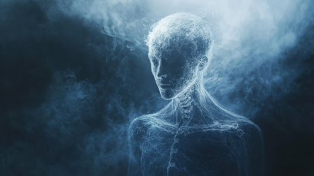 A captivating abstract image showcasing a human form emerging from fog, blending light and shadow to create a serene and mystical atmosphere.