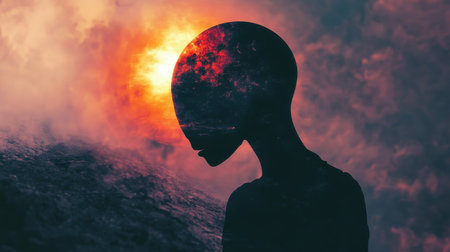 A figure stands in profile, featuring a head filled with cosmic elements, set against a vibrant celestial background during dusk. The colors blend beautifully, evoking a sense of wonder.