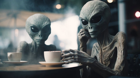 An AI generated illustration of two gray aliens sitting in a cafe drinking coffee