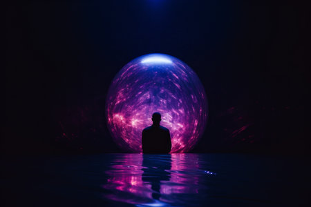 a person sitting in front of a purple sphere