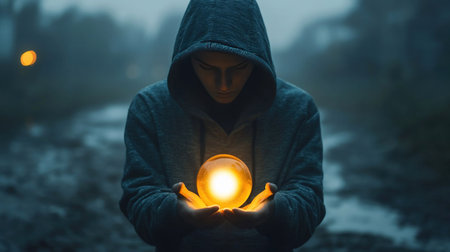 A person in a hooded jacket holds a bright, glowing orb in a misty forest setting.