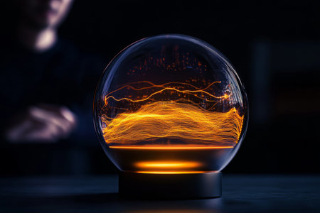 Futuristic glass sphere with glowing orange light trails and earth map on a dark background