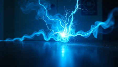 An illuminated orb, emitting electric energy, is showcased against a dark backdrop. The visual elements include vivid blue and white colors, and a dynamic composition with hints of smoke. This image could be applicable for various commercial and artistic endeavors, offering versatile visual appeal.