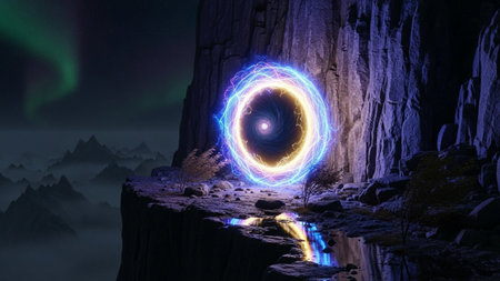 A vibrant, swirling portal of electric blue and yellow light crackles on the edge of a rocky cliff. The portal emits a powerful glow, illuminating the rugged terrain and a small pool of water reflecting the light. Above, the aurora borealis paints the night sky with streaks of green and purple. The background misty mountains, creating a surreal and otherworldly landscape.