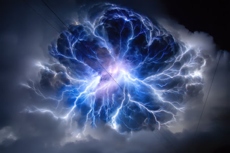 Bright lightning forks across dark storm clouds, creating a dramatic and electrifying atmosphere.