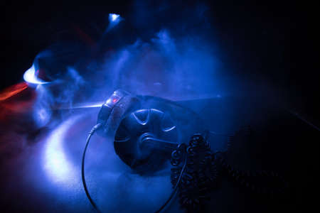 Dj music club concept. Close up headphones on dark background with colorful light. Selective focus