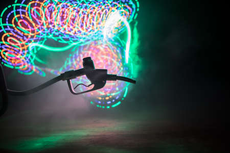 Creative concept. Silhouette of gasoline pistol miniature on dark toned foggy background. Fuel gun close up burning. Selective focus