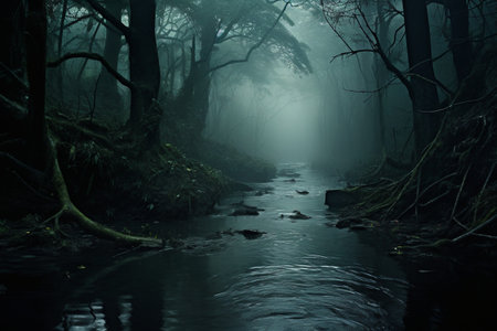 dark and mysterious forest with towering trees, a misty atmosphere, and a sense of foreboding. AI Generative