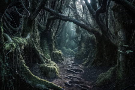 Mystical forest landscape with trees silhouettes in dark. Path in magical dreamy forest. Created with Generative AI