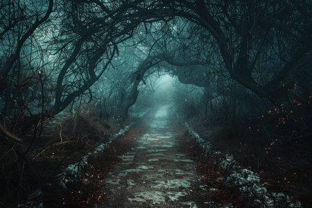 Hauntingly beautiful view of a forest path under the eerie light at twilight, invoking a sense of mystery