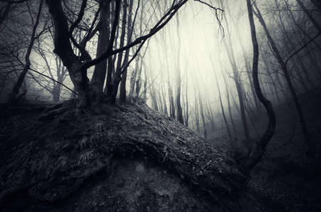 Surreal dark fores. Mysterious haunted Halloween forest. Strange light in mysterious dark fantasy fairy tale forest with mist