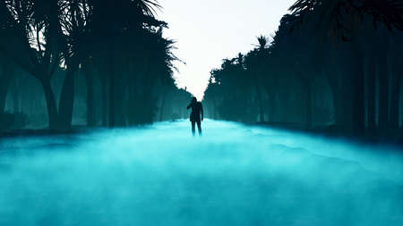 Mysterious dark forest with a silhouette of a man in a dark fog