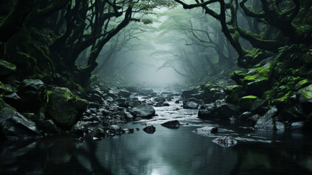 Mysterious fog envelops a lush forest creating an atmospheric escape