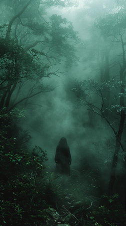 Mysterious silhouette of a figure walking through a misty forest, eerie and suspenseful atmosphere