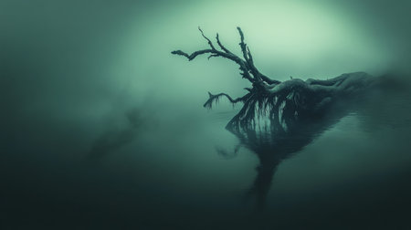 Submerged Weathered Tree Roots in Misty Green Water Mysterious Nature Scene Dark Moody Photography