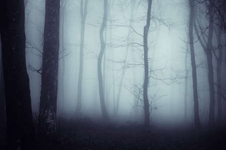 Dark mysterious forest in Halloween night with fog