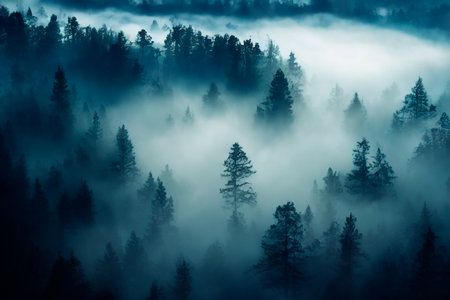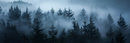 Enchanting Mystic Wilderness Scene with Pine Trees Shrouded in Fog, Capturing Nature s Tranquility
