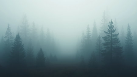 Dark pine trees shrouded in thick fog create a mysterious and atmospheric forest scene, evoking a sense of tranquility and isolation.