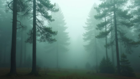 A serene misty forest landscape featuring tall pine trees enveloped in fog. The atmosphere is tranquil, showcasing nature's mysterious beauty and depth.