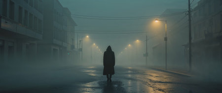 AI Generated. Solitary Figure Walking Down Empty Street in Mysterious Foggy Atmosphere at Dusk