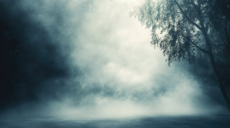 Moody landscape featuring silhouetted trees in a dense, ethereal fog. The dark branches contrast with the soft, diffused light, creating a sense of mystery and tranquility.