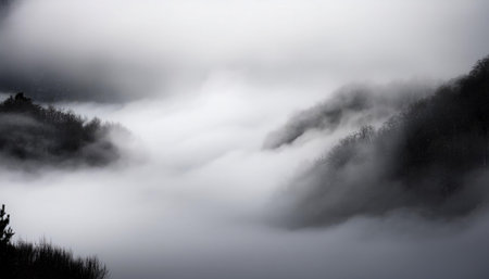 Fog rolling through a forested mountain valley creating a moody atmospheric scene