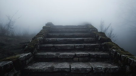 A foggy stone staircase with cracked steps leading up into the unknown darkness above.