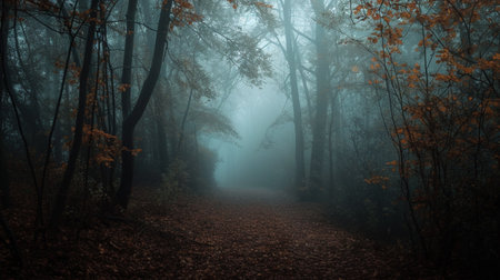 Path through a dark forest autumn fog at night