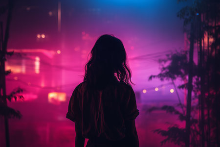 Dark silhouette of stranger woman standing in neon lights. Cyberpunk girl in spectacles at modern glow night city.