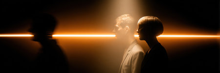 Three individuals are captured in a dimly lit environment, with a glowing line creating a striking contrast.