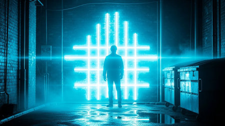 Young cyberpunk female with her face half painted in black standing in front of camera against bars and illuminated hieroglyphs