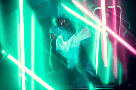 Geometric lines. Cinematic portrait of stylish young man in neon lighted room. Bright neoned colors. African-american model, musician indoors. Youth culture in party, festival style and music concept.