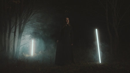 Young woman with long blond hair, wearing a long black dress, posing in a dark forest at night, with two neon lights illuminating the fog around her, creating a mysterious and evocative atmosphere
