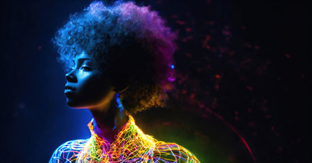 Beautiful african american woman with afro hairstyle and outlined in light. ai generative.