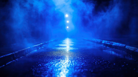 A captivating foggy night street scene featuring a blue atmosphere, soft light effects, and a reflective wet road, evoking mystery and tranquility.