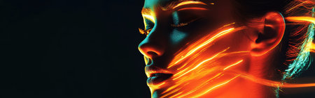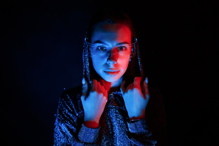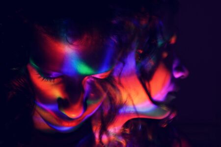 abstract portrait of young girl under colorful fluorescent Neon dark lights, enigmatic style