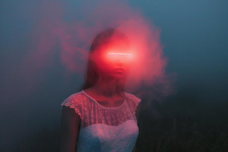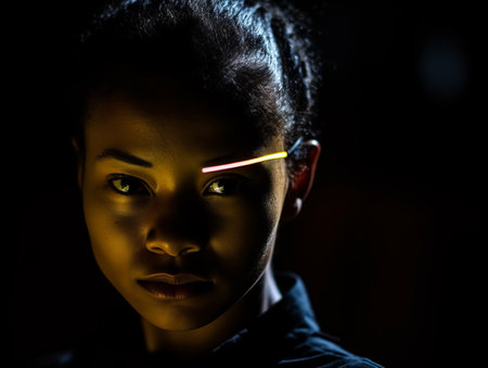A woman with a serene expression glows as bright light streaks dynamically flow across her face, creating an ethereal atmosphere in a dark setting.