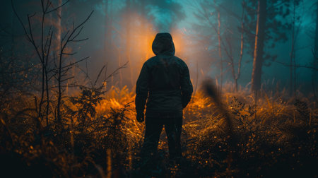 A mysterious concept of a hooded man, waiting on a path. On a spooky foggy night in a city. With a dark, moody grunge edit.