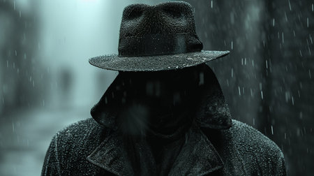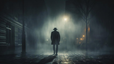 dark silhouette of a man in a raincoat with a hat at night