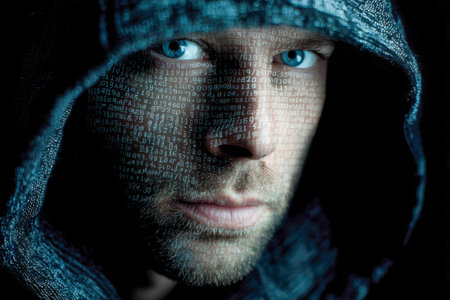 A mysterious figure draped in a dark hood, piercing azure eyes behind shadows, with streams of binary data layered across the scene emphasizing digital defense and cyber
