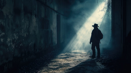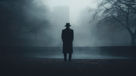 Mysterious Figure Emerging from Fog, Wearing a Hat and Exuding an Eerie Vibe that Intrigues