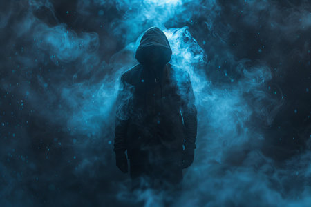 Stylish man in dark hoodie, black glasses and mask dark background in blue light, hacker, attacker and bandit