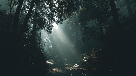 Bright rays of sunlight pierce through the lush greenery of a rainforest, illuminating the misty air and revealing diverse plant life in the serene morning atmosphere.