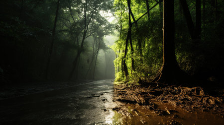 An atmospheric scene depicts a dense forest with tall trees and flowing water. The image presents a moody aesthetic with a cool color palette and soft lighting. The composition suggests an outdoor environment, possibly a day setting. This visual may be suitable for editorial or commercial content relating to nature or the environment.