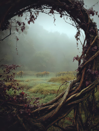 A striking circular frame of twisted vines captures a misty landscape filled with lush greenery and a serene atmosphere, perfect for nature-themed projects.