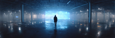 A solitary figure stands in a vast industrial setting filled with fog and blue light, reflecting on the wet floor. An intriguing atmosphere surrounds the scene.