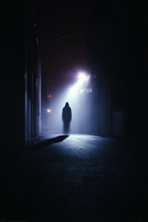 A ghostly figure emerges from the shadows on an empty street, creating a cinematic horror tone. The high contrast between light and dark enhances the eerie atmosphere in this night photography.